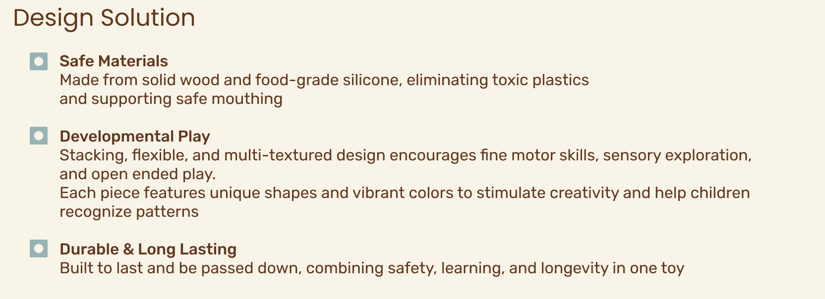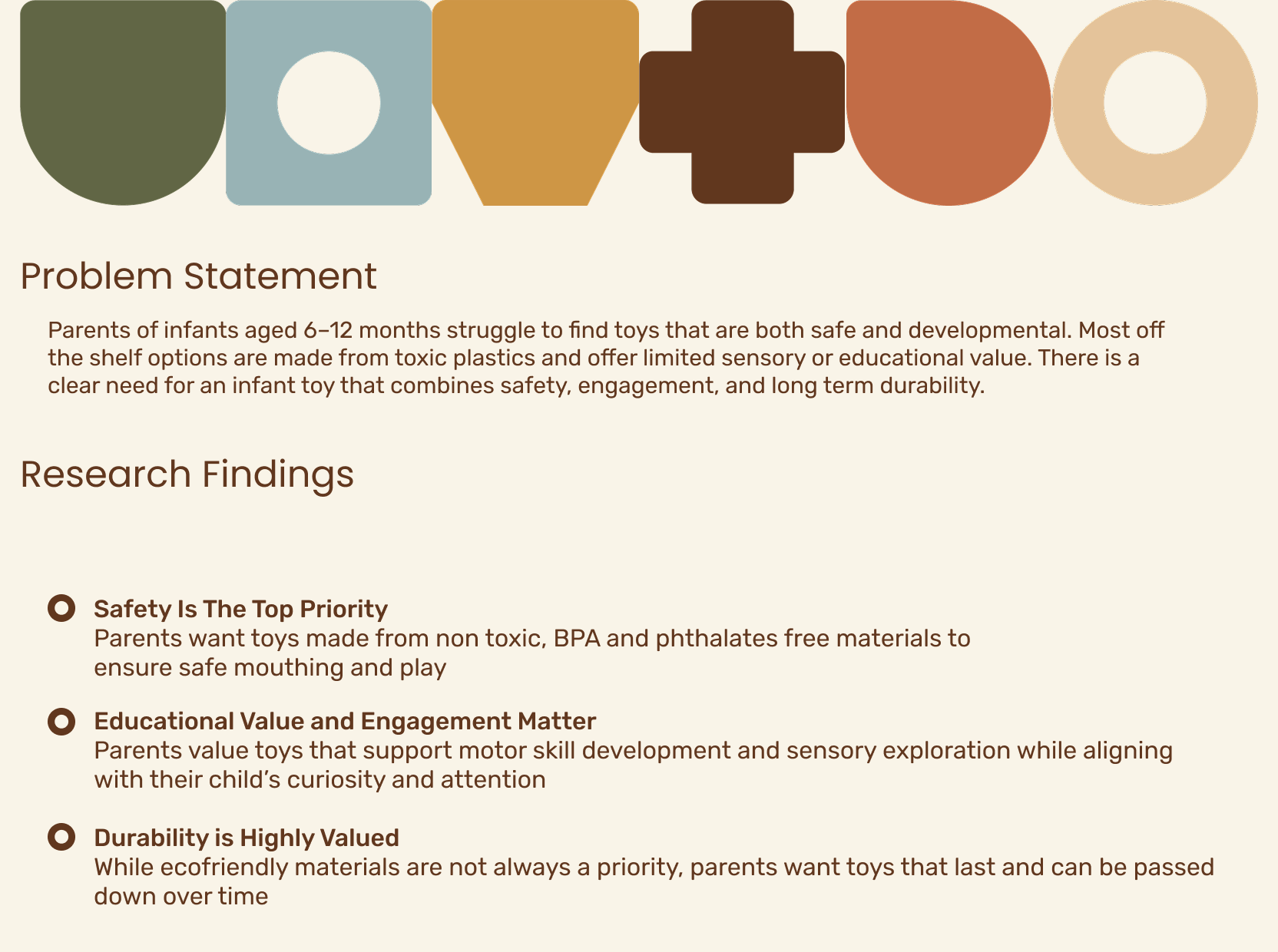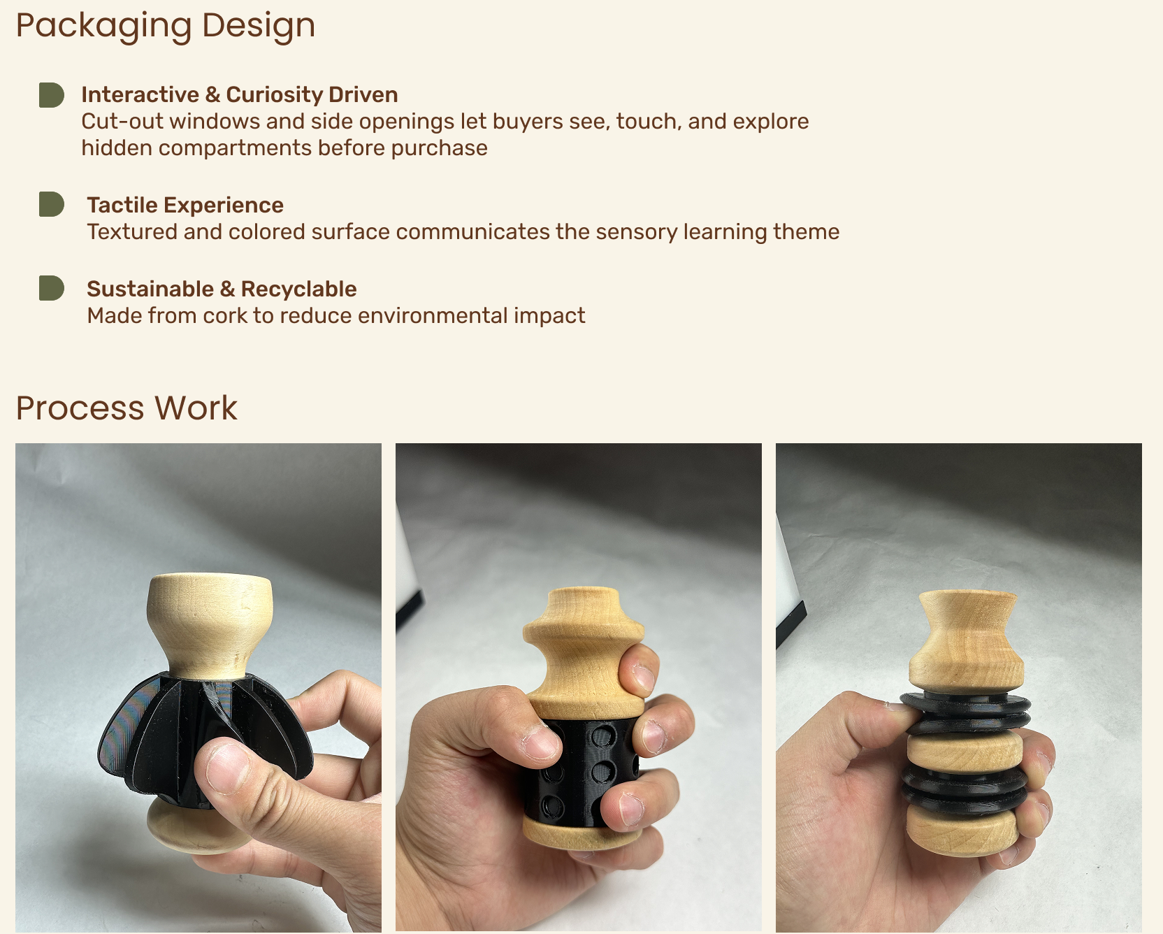 Tinker Totem was designed for infants whose parents struggle to find safe, developmental toys at big-box retailers such as Walmart and Target. Multiple rounds of surveys and interviews were conducted to better understand buyer needs. The project explores the combination of wood and silicone, alongside custom packaging and brand identity design to tie the system together.